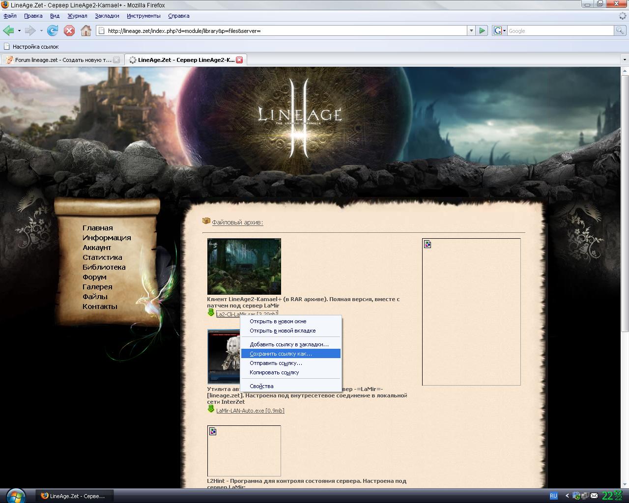 скачиваем готовый клиент из файлов ( http://lineage.zet/index.php?d=modul...=files&server= ). чтобы это сделать жмём правой кнопкой по названию и выбираем "сохранить ссылку как"(Шаг 1). далее выбираем место сохранения и ждём пока у скачается! данный вариант не хорош тем, что как правило время сохранения непредсказуемо: у кого то 2-3 часа у кого то 10 часов. если первое пережить можно - то второе наврятли:help: согласитесь всё элементарно!