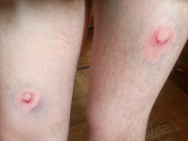 Кстати по поводу больности(=))... сегодня в пейнтбол гоняли, так мне с электронного маркера из-за укрытия в упор по ляжкам очередью полоснули=) и вот результат: