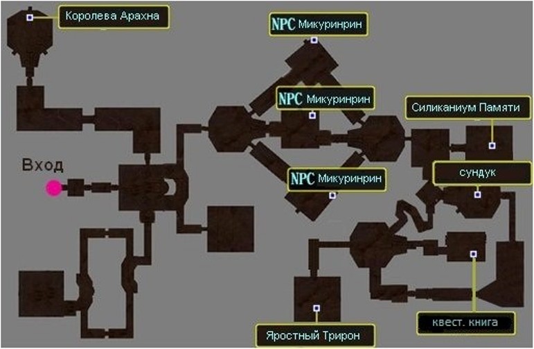 В коридор с пауками (левый) ходить совершенно не обязательно, но если вы хотите одеть своего женского персонажа в красивый наряд леди, или примерить ей диадему, то убиваем Королеву Арахна. Она даст нам ключ от сундука лаборатории в котором и может лежать с некоторым шансом это платье или головной убор леди(это в лаборатории теомобоса).